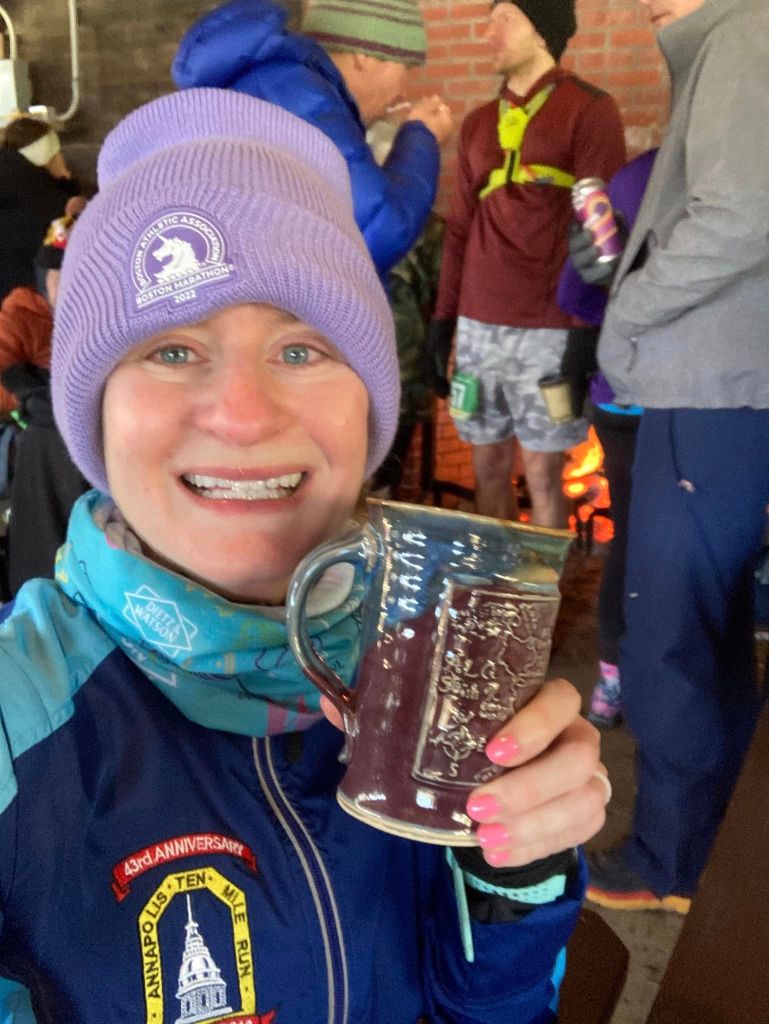 When my watch beeped at 30 miles, I knew the finish line was near. I was more than ready to be done by then, but kept patiently trucking along. Really, those final two miles were kind of a blur. At one point, we crossed a road and then headed toward the field where the start/finish was. Jen told me to look for the flags lining the finishers chute and head toward them, so that’s what I did. After 6 hours and 15 minutes of running, I crossed the finish line and was awarded my prized finishers mug. Micah was waiting for me at the end and he directed me toward the nice food spread in the pavilion, where there was also a roaring fire going. I wasn’t super hungry, but I enjoyed some hot Maryland crab soup, a beer, and yes, more cake.