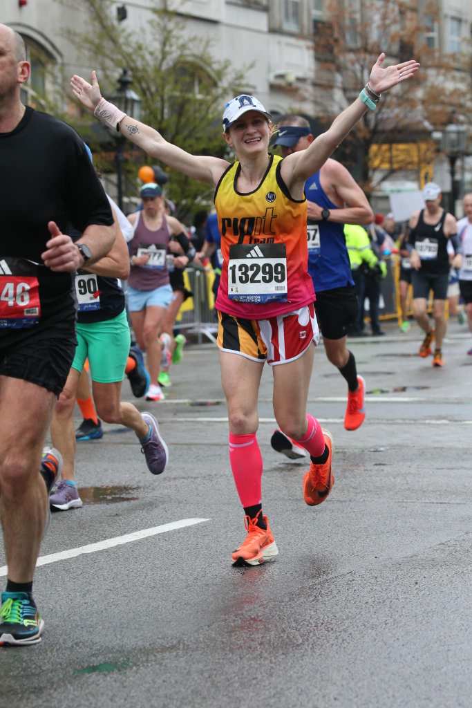 Miles 12 and 13 were speedy — 7:21 and 7:15. This is when the race goes through the Wellesley Scream Tunnel and the energy is like none other. You can hear the screams a mile away. I high-fived so many Wellesley women and saw some men kiss a few of them, too.