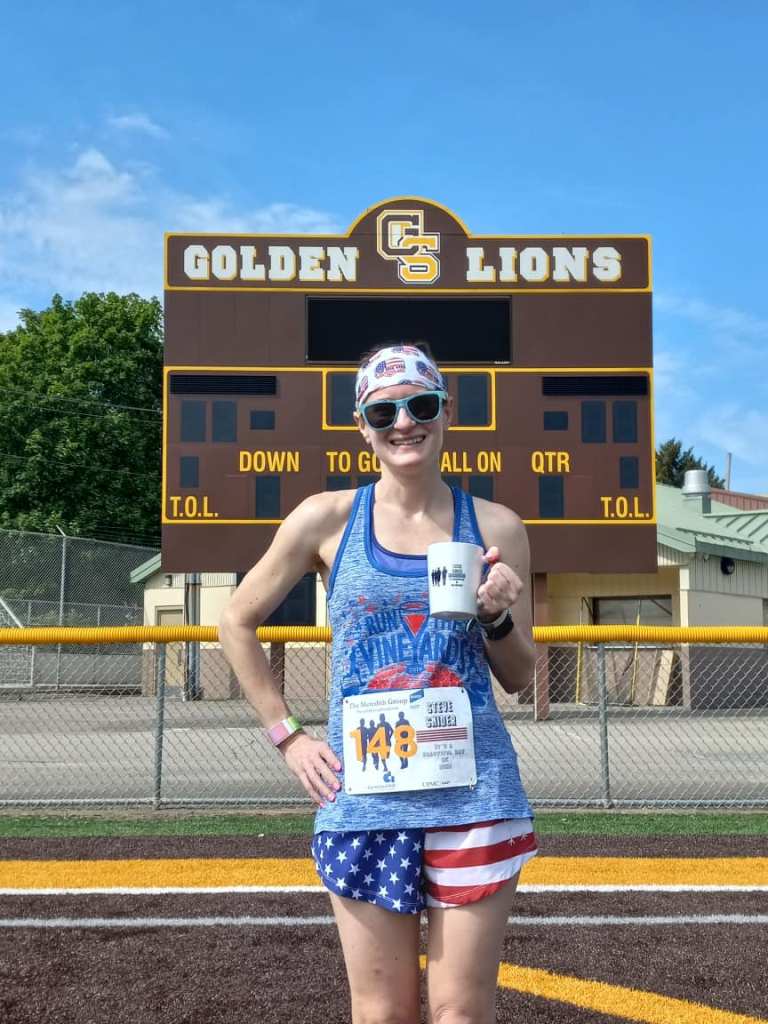 I saw there was a 5K happening back home in honor of the longtime former track and field coach at my high school. I didn’t run in high school, but remembered Coach Snider well and figured I’d sign up. The race finished on the high school football field, and I thought it would be so fun to be on the field for the first time since I’d twirled a flag at football halftime shows 25 years ago!