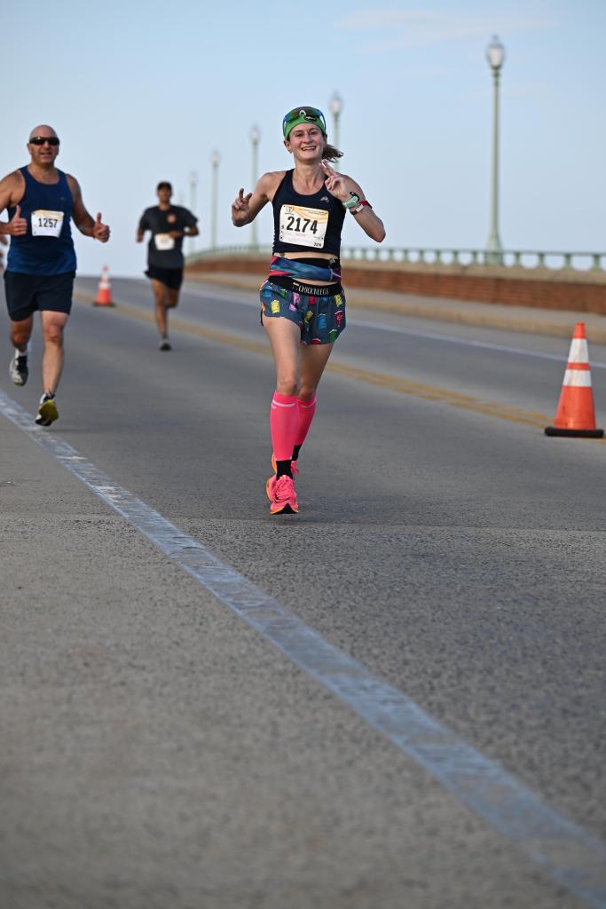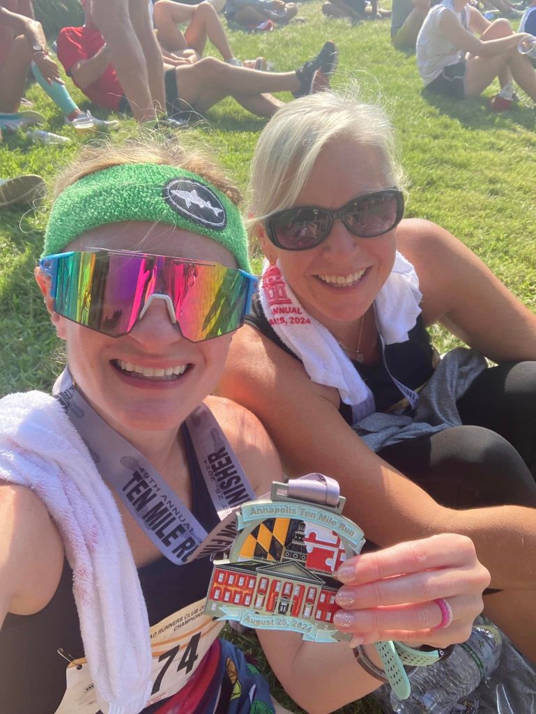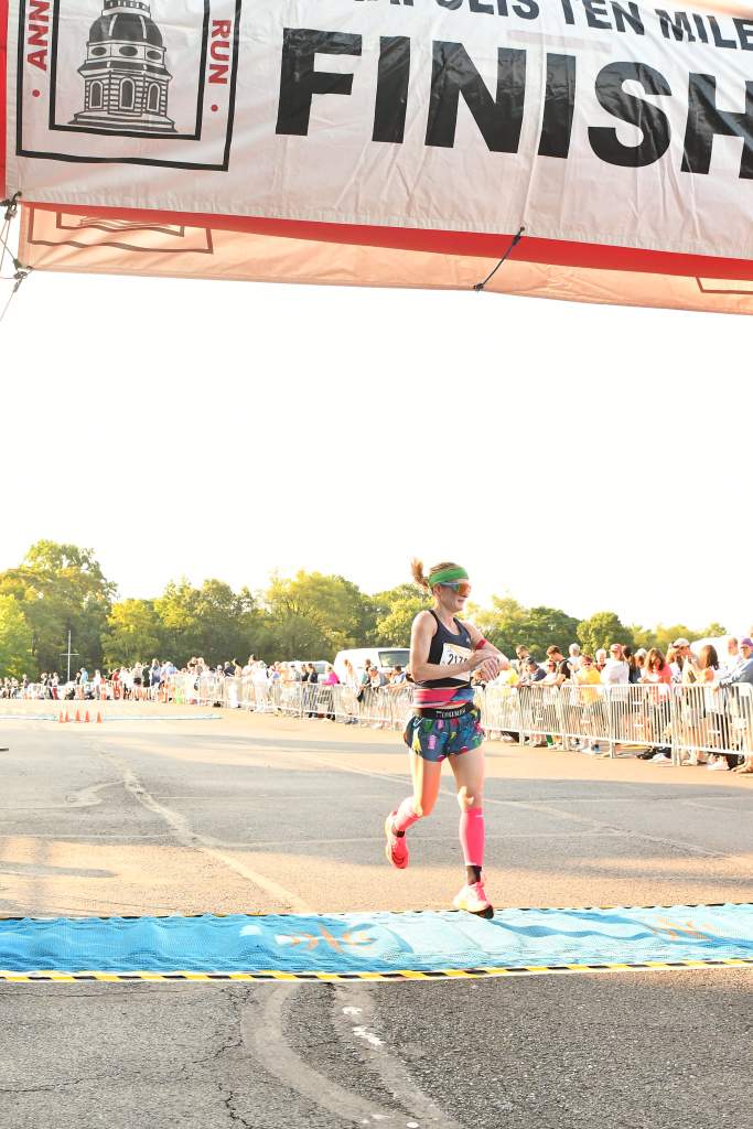 Since I’ve now run this race 10 times, and I live locally, I know the course like the back of my hand. The first few miles are fast. You leave the stadium and do a lap around it, then head toward downtown Annapolis and down Main Street (I always have to be careful not to trip and fall on the cobblestones here!) I saw a big crew of She Runs This Town friends at the intersection of Rowe Boulevard and Taylor Avenue, and they cheered for me so loudly, which really pepped me up!